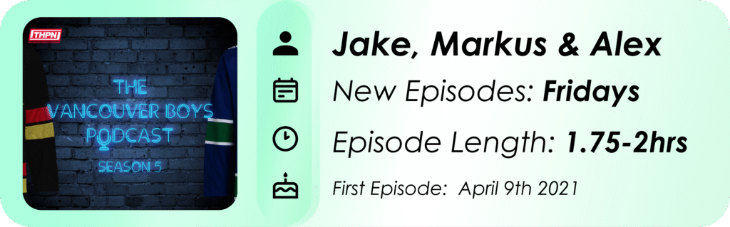 “Jake Jude, Marcus Keller (better known as @canucksvideos from TikTok), and Alex Smith host this weekly episode podcast, and their dynamic is exactly what it sounds like: three friends who like to talk, debate, and crack jokes about the Canucks, the NHL and pretty much any player, team, coach, organization, whatever, what-have-you.
